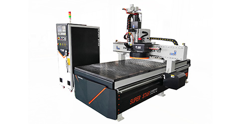 目前市場上的圓盤換刀開料機一般來說都配備8刀頭以上的圓盤刀庫。刀庫可隨龍門移動,能夠快速的進行更換,節(jié)省了換刀時間。超星數(shù)控生產(chǎn)的圓盤自動換刀開料機除普通型號以外,還有加排鉆的一款設(shè)計,除了加載的圓盤刀庫,還加載排鉆,能夠更好的滿足鉆孔的加工需求。
